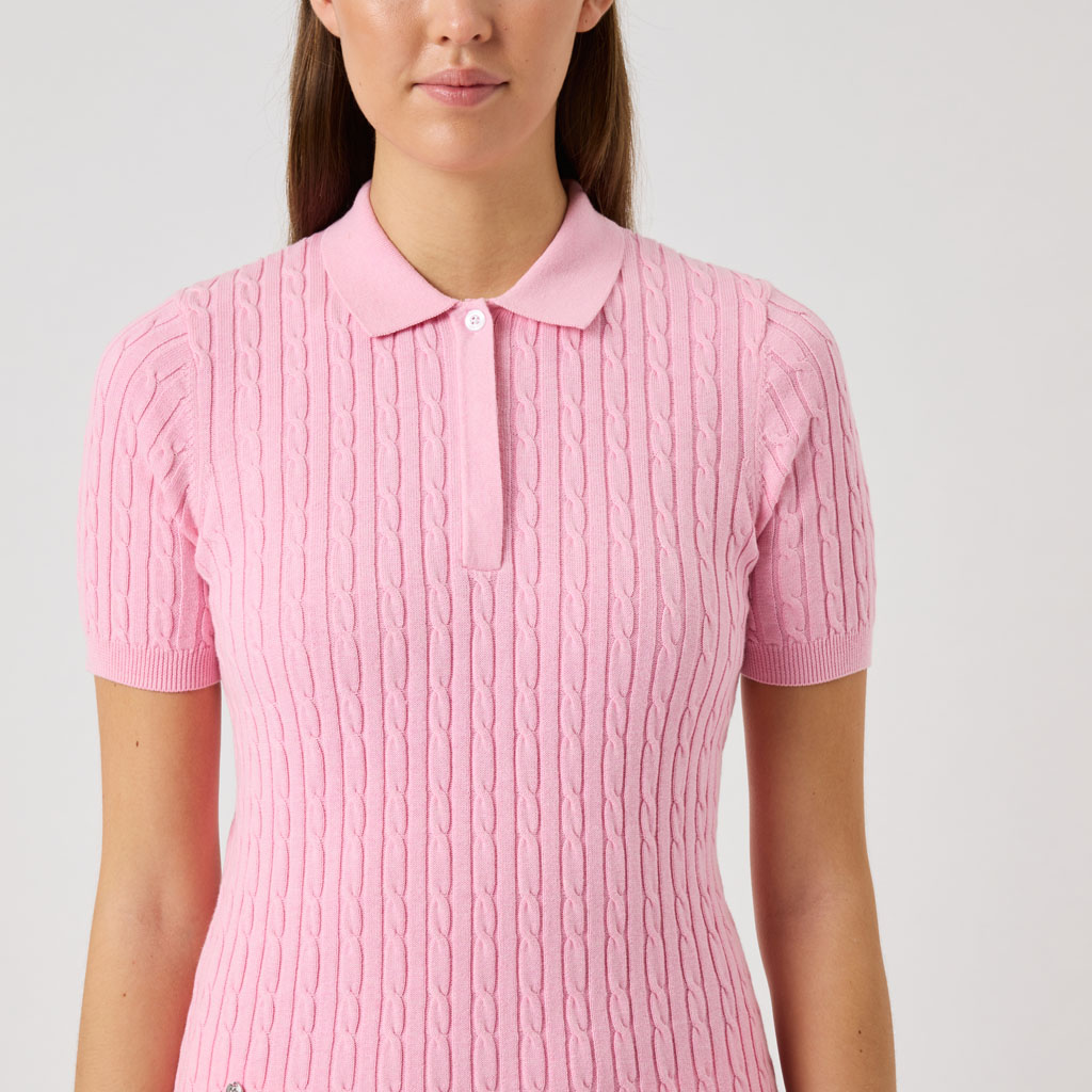 Het Madelene poloshirt van Daily Sports is een classy damesshirt met korte mouwen in een kabelpatroon gemaakt van comfortabel zacht katoen materiaal met een touch van cashmere voor een heerlijk zacht gevoel. 95% katoen, 5% cashmere. Kleur prism pink