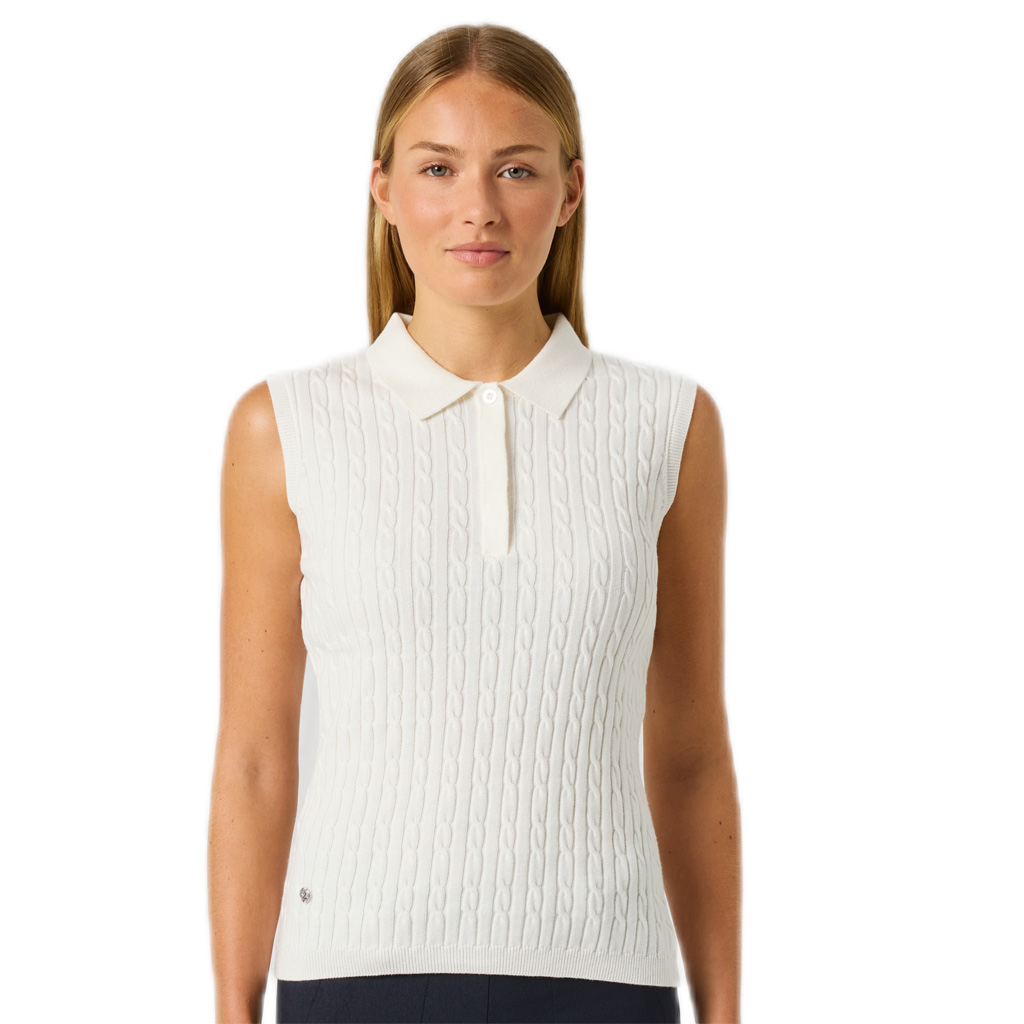 Het Madelene sleeveless poloshirt van Daily Sports is een classy mouwloos damesshirt in een kabelpatroon gemaakt van comfortabel zacht katoen materiaal met een touch van cashmere voor een heerlijk zacht gevoel. 95% katoen, 5% cashmere. Kleur (room)wit