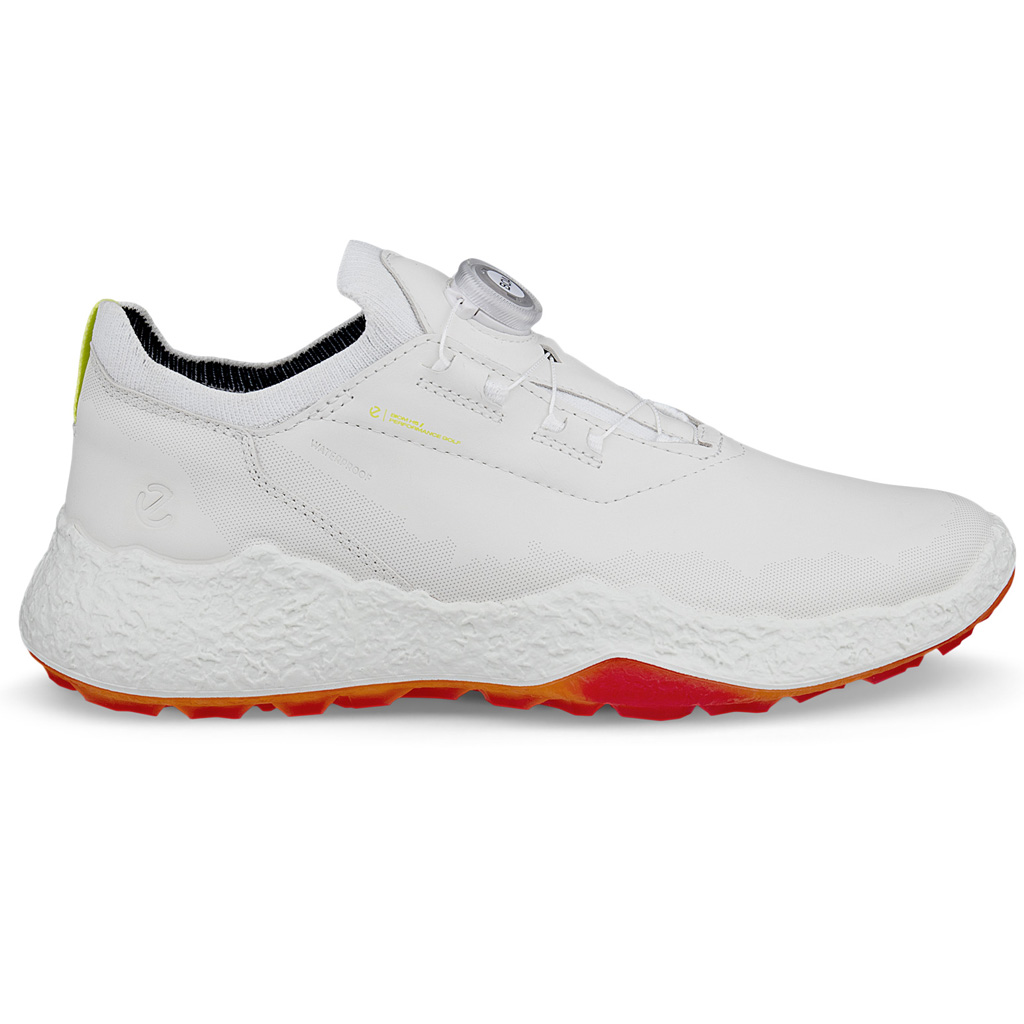 Ervaar ultiem comfort en prestaties met de ECCO Biom H5 Boa® dames golfschoenen. Biom® Natural Motion technologie bevordert een krachtigere, stabiele swing, terwijl waterdicht GORE-TEX je droog houdt. ECCO FLUIDFORM™ zorgt voor een gedempte, ondersteunende pasvorm voor de hele dag spelen. Het innovatieve Boa® Fit System biedt een moeiteloze, micro-instelbare veilige pasvorm met een simpele draai. Deze schoenen combineren geavanceerde technologie met een slanke, moderne stijl en zijn de perfecte keuze voor de veeleisende golfster die haar spel naar een hoger niveau wil tillen, Kleur Wit