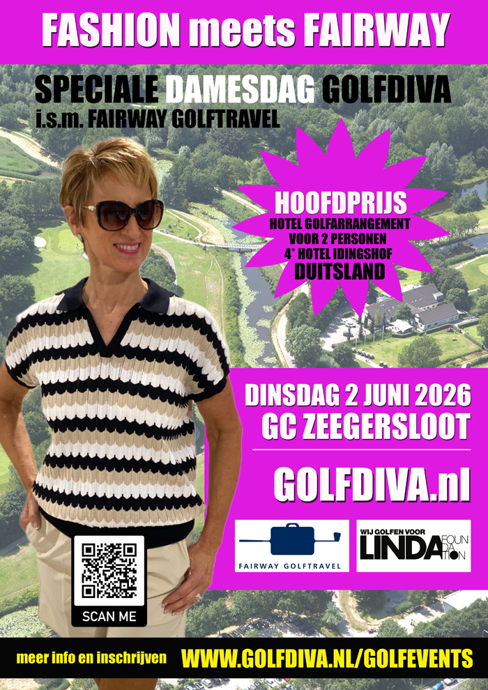 Het wordt een 18-holes Single Stableford wedstrijd, max playing handicap 36 waarbij natuurlijk ook extra prijzen te winnen zijn zoals de Neary. Team Golfdiva is aanwezig met de Fashion Corner en natuurlijk golfen we ook deze dag weer voor de LINDA.foundation, het goede doel waar Golfdiva zich al jaren sterk voor maakt. Op 2 juni is er ook nog een verloting tbv de LINDA.foundation. Op de dag zelf kun je hiervoor loten kopen.