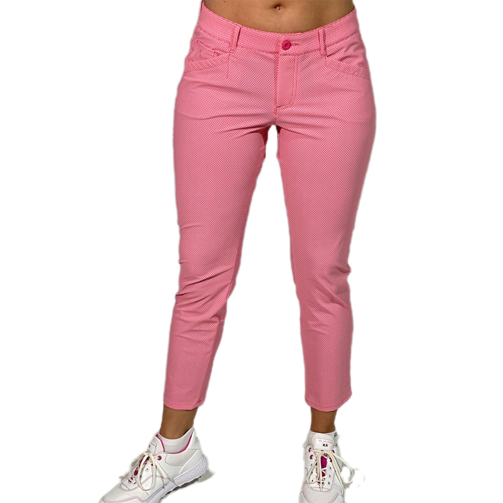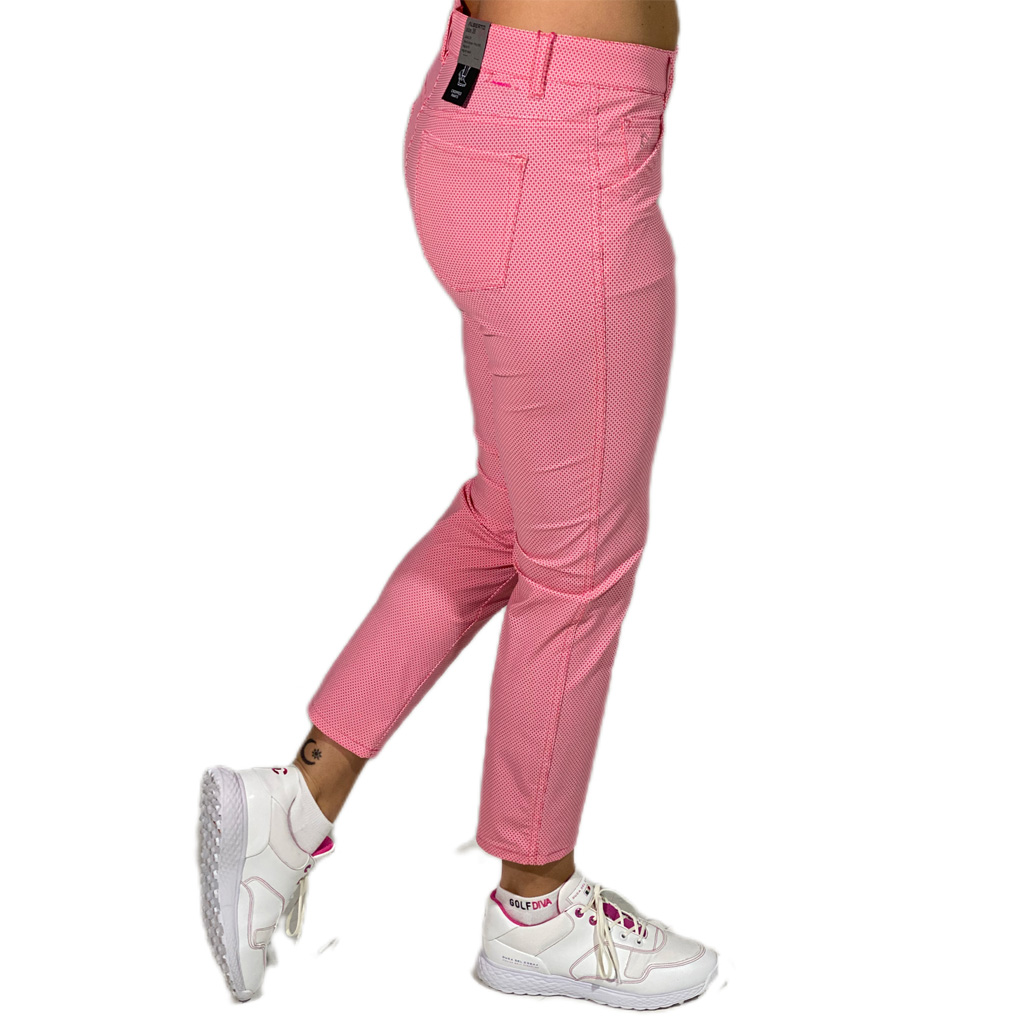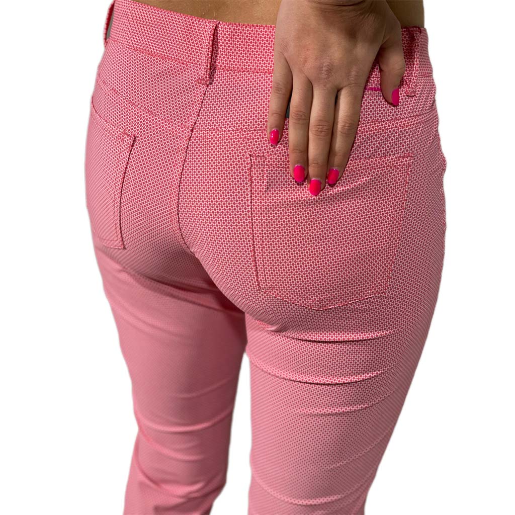 Deze Jana golfbroek van Alberto is een geweldige damesbroek in een tijdloze blauw/wit print. Het super stretchy materiaal van deze golfbroek zorgt voor veel comfort en maximale bewegingsvrijheid. De zomerbroek heeft een 7/8 enkel-lengte, heeft steekzakken en knoop- en ritssluiting. Bovendien is de broek waterafstotend. Valt normaal in de maat. 71 % Nylon, 29 % Elastane. Kleur rood/wit