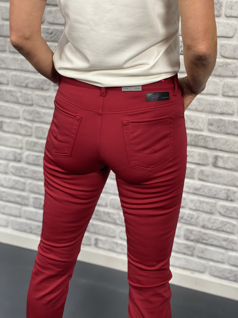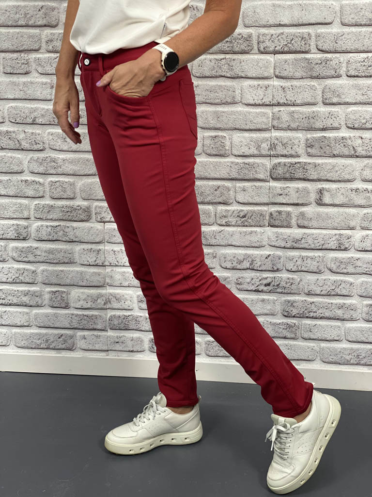 De Jana Stretch Energy damesbroek van Alberto is een fantastische winterbroek met een geborstelde binnenkant voor extra warmte, met slim fit pijpen en een normale taille. Knoop- en ritssluiting en riemlussen. De bi-elastische stof uit Japan genereert warmte door de vezels op te rekken. Deze comfortabele golfbroek is wind- en waterafstotend, ademend en het superstretchy materiaal zorgt voor maximale bewegingsvrijheid. 88% polyamide, 12% elastane. Steekzakken voor en achterzijde. Kleur Dark Red.