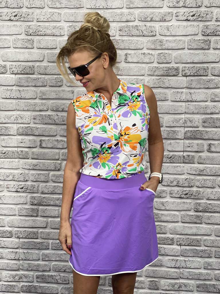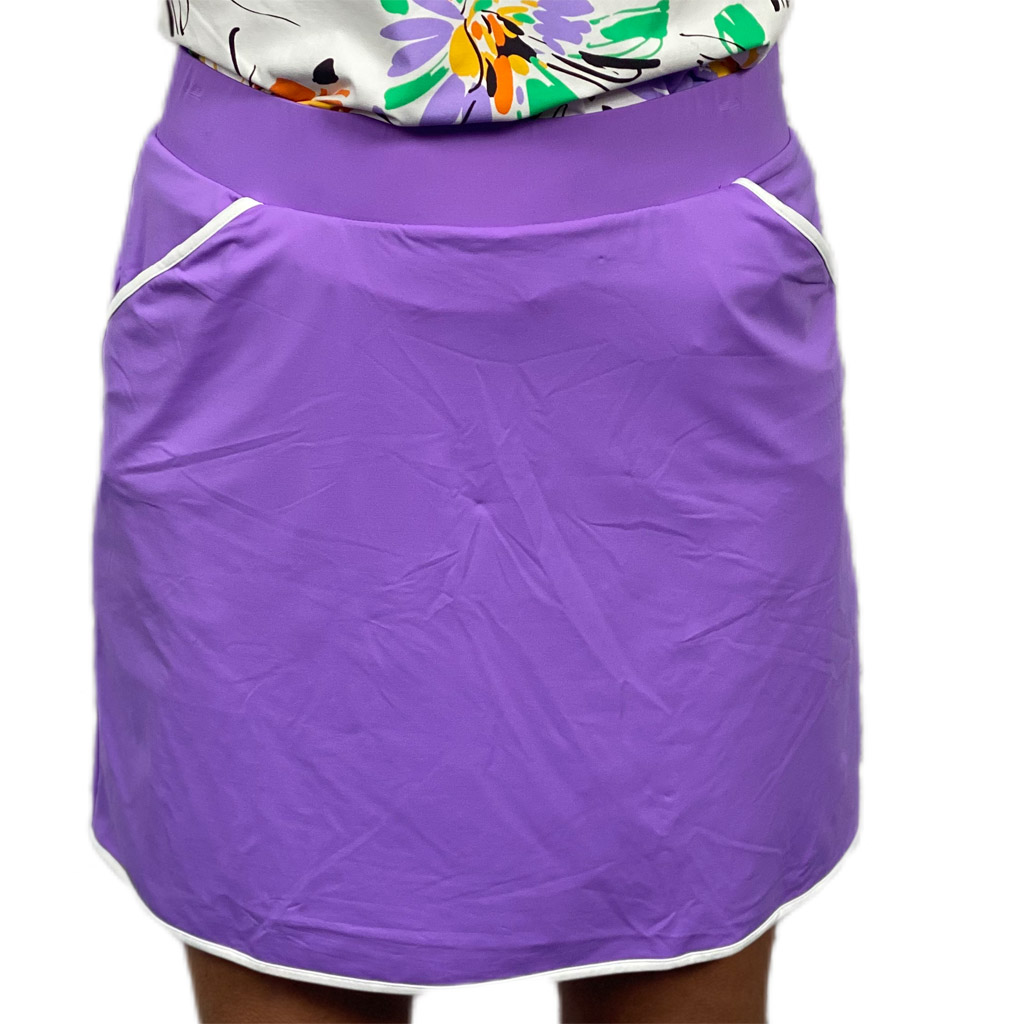 Het Suri rokje van Chiberta is een sportief golfrokje. Het is een pull-on model incl binnenbroekje. Het rokje heeft steekzakken. 80% polyamide 20% elastane. Het stretchy materiaal zorgt voor maximale bewegingsvrijheid. Kleur paars met witte belijning.