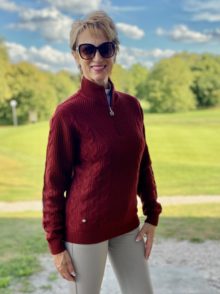 De nieuwe Cable LS Pullover van Daily Sports is een geweldige pullover die volledig winddicht gevoerd is. Stoer sportief kabelpatroon. Halve ritssluiting. 30% wol 70% acryl. Kleur winery