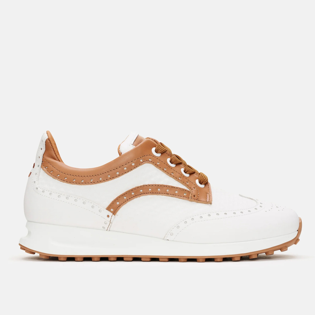 De Serena damesschoen van Duca del Cosma is een waterdichte golfschoen met een stijlvolle chique sportieve look. De schoen is zeer comfortabel, heeft dezelfde DF4 medium fit als de populaire Bellezza en heeft een klassiek en tijdloos design. Gemaakt van premium kwaliteit Italiaans Nappa leder in combi met zacht PU materiaal. Comfortabele ademende ARNEFLEX foam binnenzool. Met de noppenzool kun je de schoen ook buiten de golfbaan dragen. Kleur white/cognac