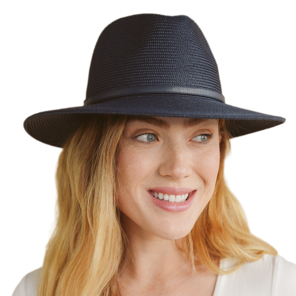 De Contour Fedora hoed van House of Ord biedt de perfecte mix van comfort en verfijning. Dit elegante model, met een klassieke ingedeukte kroon, flatteert hoekige en diamantvormige gezichten prachtig. Ontworpen met uw volgende golfreis in gedachten, is de Contour een volledig opvouwbare zonnehoed. Om in te pakken, drukt u hem gewoon plat in uw koffer of strandtas, deze hoed is zeer reisvriendelijk. Compleet met UPF50+ gecertificeerde UV-bescherming om u te beschermen tegen schadelijke stralen, en een verstelbare maatband voor een onberispelijke pasvorm. Het is de ultieme UV-werende zonnehoed voor stijlvolle, zonveilige avonturen op de golfbaan. Maat 58 cm. Kroonhoogte 9,5 cm Randbreedte 7,5 cm. 100% Polybraid. Handwasbaar. Plat opvouwbaar, kreukherstellend. Met de Comfy-Fit elastische band met clip aan de binnenzijde kun je zelf de maat aanpassen naar de juiste grootte. Kleur navy