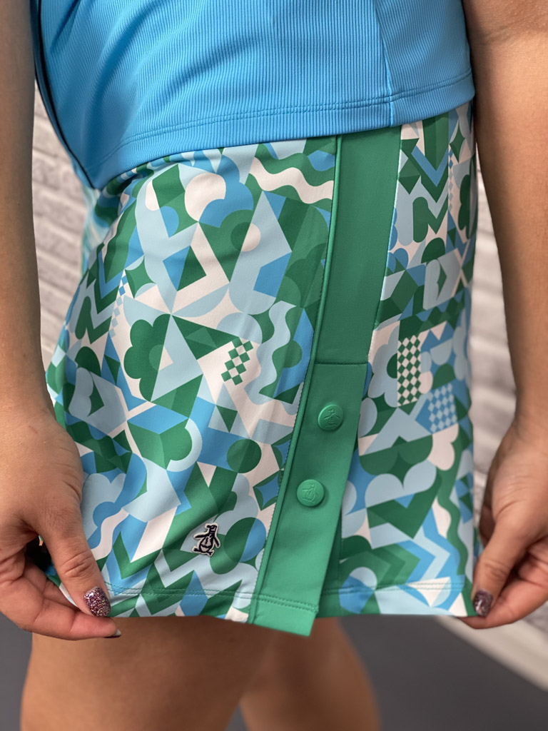 De Printed A-line skort van Originel Penguin is een geweldig leuk golfrokje in vrolijke print en speelse knoopdetails aan de zijkant. Incl binnenbroekje. Gemaakt van stretchy ademend sneldrogend materiaal. Pull-on model met elastische tailleband. 44% polyester 44% recycled polyester 12% elastane. Kleur Emerald groen en Aquarius blauw.