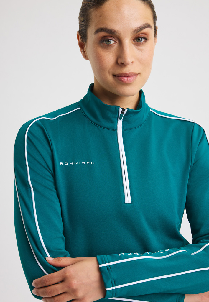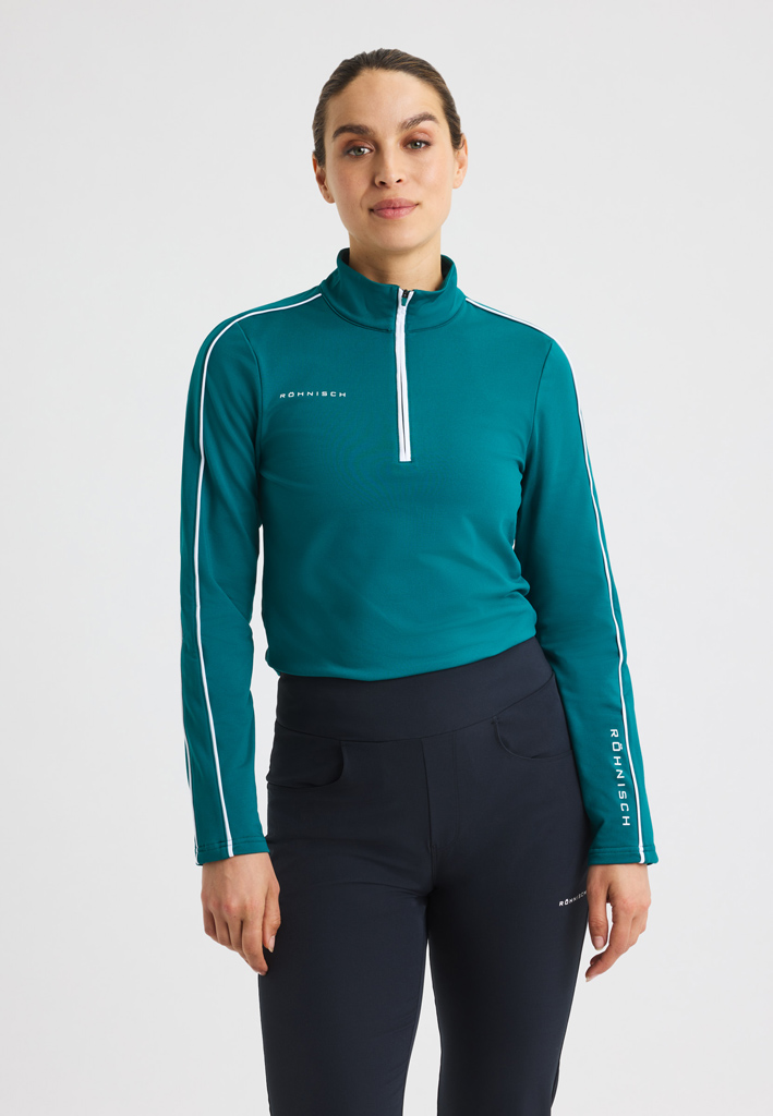 De Amie brushed midlayer van Rohnisch is een comfortabel damesshirt in een sportieve look. Perfect als tussen- of bovenlaag in de koudere maanden. Het shirt is een de binnenzijde zacht gebrushed en daardoor heerlijk om te dragen. Halve ritssluiting en opstaande kraag. De longsleeve heeft een mooie witte belijning op de mouwen. Kleur Augusta Green, een prachtige kleur op donkerblauw, zwart en zandkleur. Valt normaal tot wat strakker in de maat. Een tight fit!