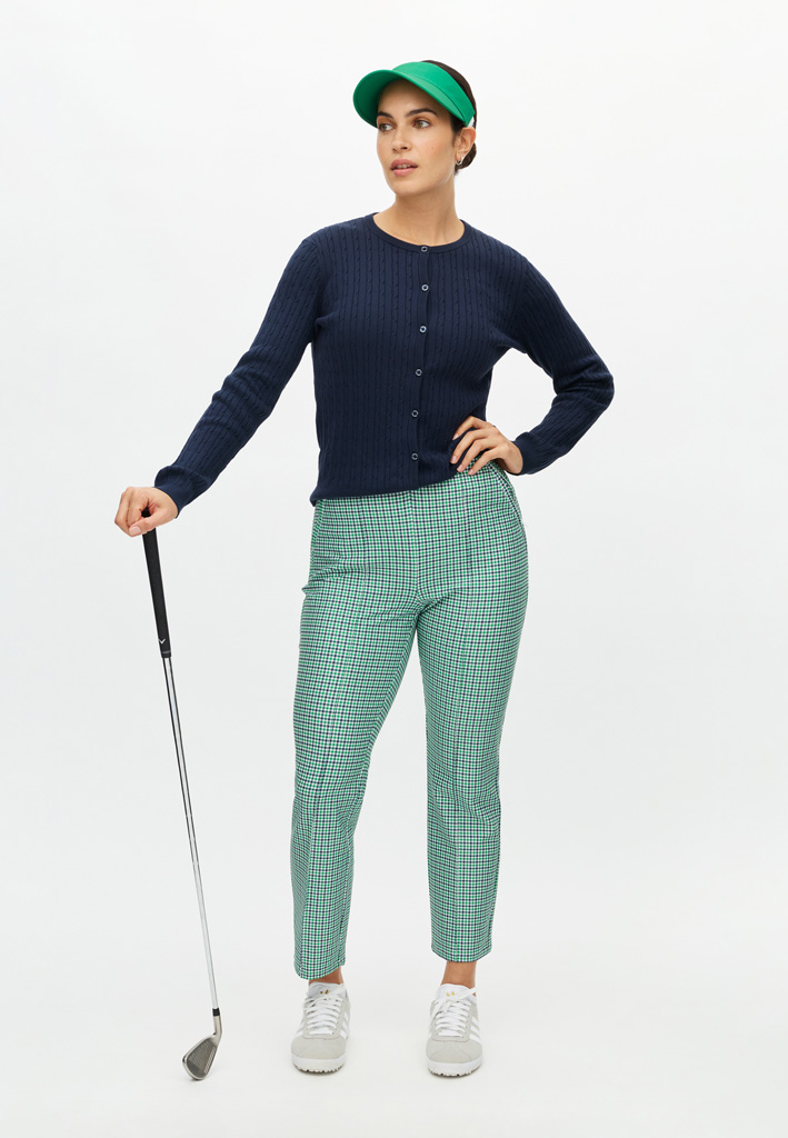 De Clubhouse Highwater broek van Röhnisch is een stijlvolle damesbroek, in enkel-lengte, gemaakt van twill stretchy materiaal dat zorgt voor maximale bewegingsvrijheid. De persplooien zorgen voor een getailleerde afwerking. Steekzakken met ritssluiting. Aan de zijkant ritssluiting. Hoge taille. Slim fit. 90% gerecycled polyester 10% elastane. Heel leuk om te combineren met wit, donkerblauw en green. Kleur Minicheck Green.