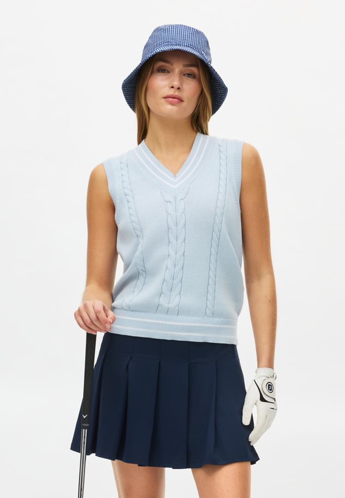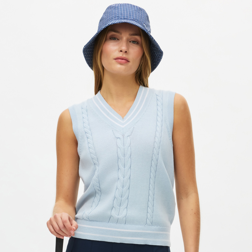 Het Cotton Cable Vest van Röhnisch is de moderne versie van een klassieke gebreide spencer met kabelpatroon. Het zachte katoen ademt heerlijk, terwijl de smalle kabelstructuur en contrasterende strepen zorgen voor een eigentijdse sportieve look. Door de iets lossere boxy pasvorm is het vest makkelijk te dragen over een polo, perfect voor op de golfbaan of voor dagelijks gebruik. 100% organisch katoen. Kleur Skyway