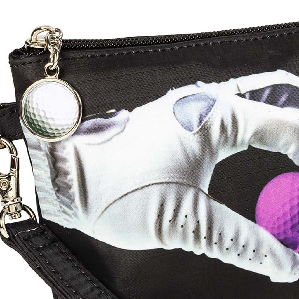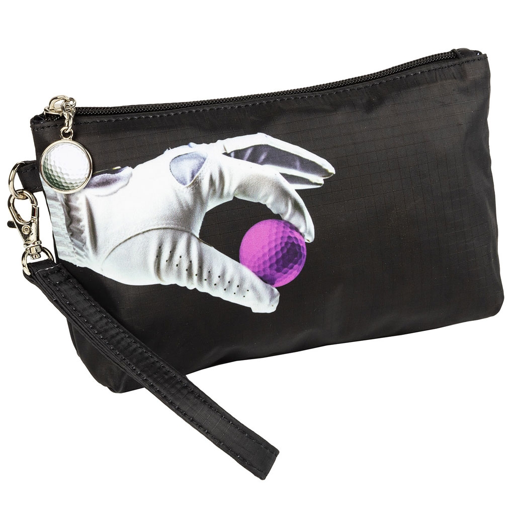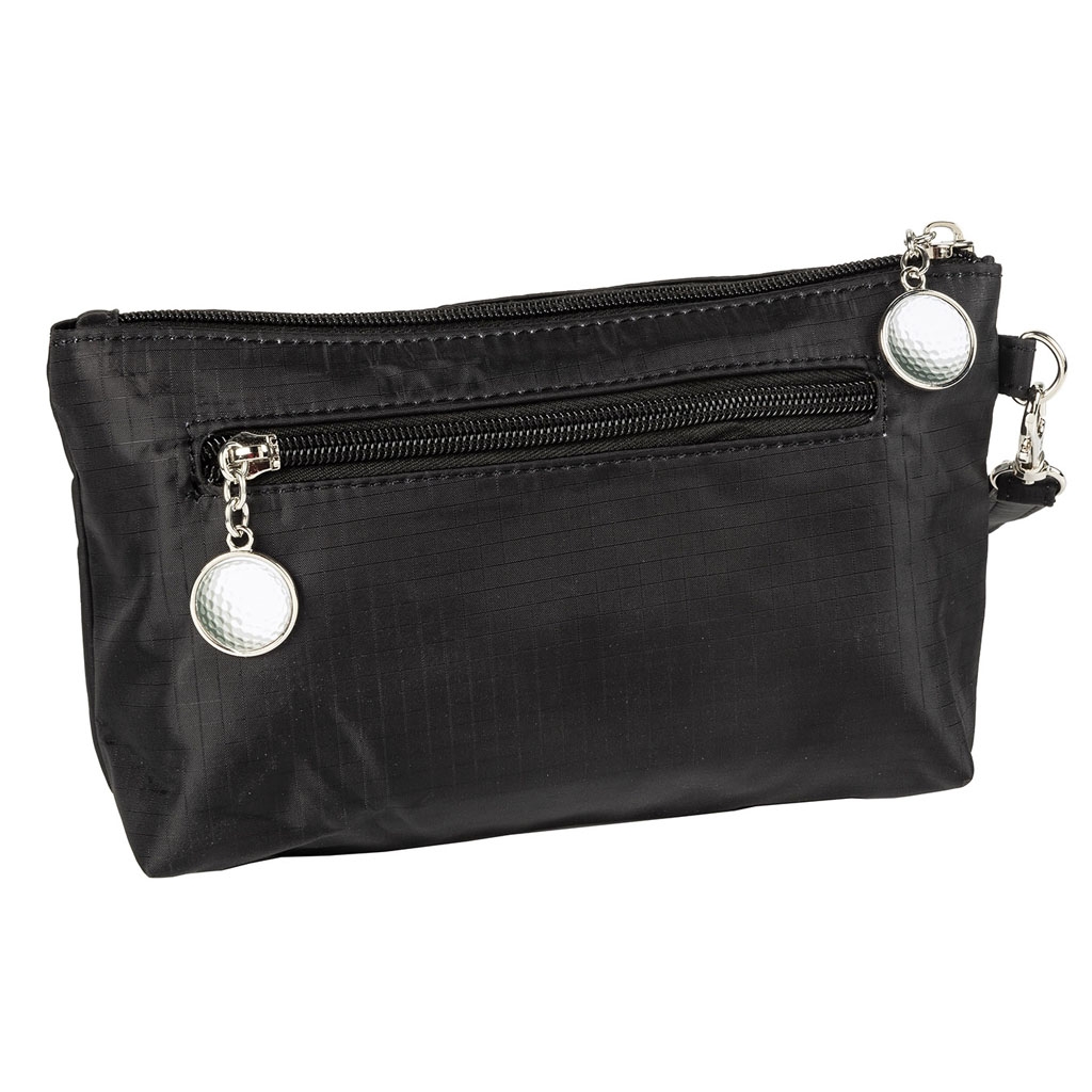 Prachtig damestasje uit de exclusieve collectie van Sydney Love. Handig voor je accessoires. Zeer handig nylon cosmetica tasje met ritssluiting met golfbal-zipper. Binnenvoering met polka dots en nog een extra vakje binnenin. Extra vakje met ritssluiting aan de achterzijde. B 23 H 14 D 5 cm. Kleur zwart met mooie golfapplicatie.